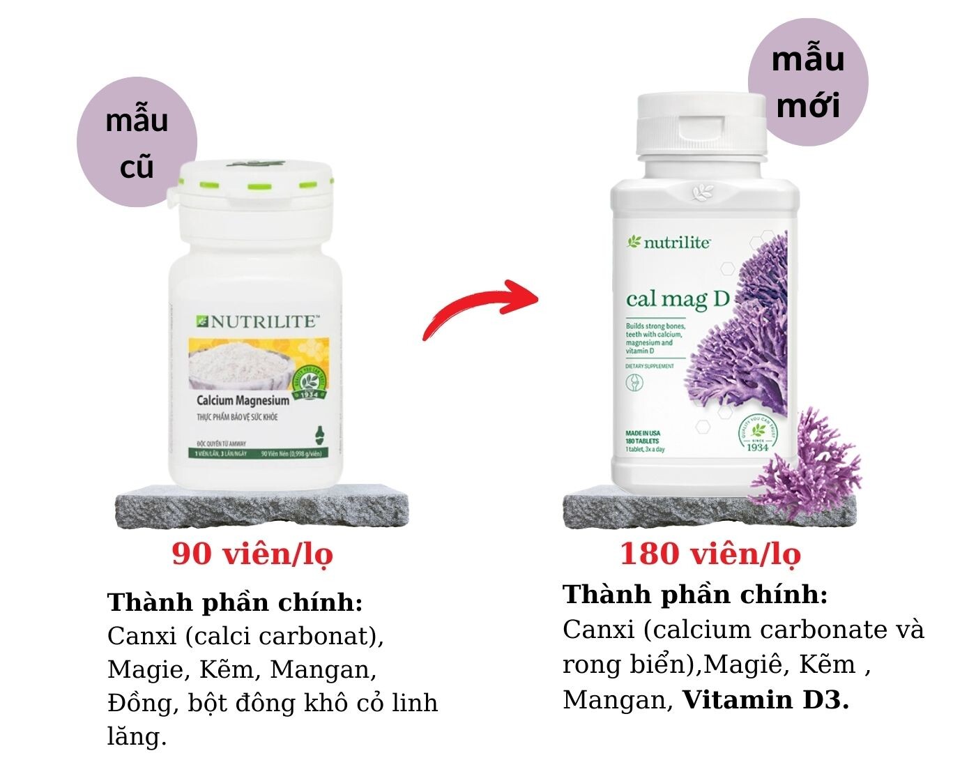 Thực Phẩm Bổ Sung Canxi Và Magiê Nutrilite: Mỗi viên cung cấp 216,7mg canxi và 108,3mg magiê, giúp hình thành và duy trì hệ xương răng chắc khoẻ. Magiê giúp cơ thể chuyển hóa carbohydrate. Sản phẩm này thích hợp với thanh thiếu niên đang trong giai đoạn cơ thể phát triển nhanh, những người trung niên đặc biệt là phụ nữ, những người hay sử dụng đồ uống có cồn, phụ nữ có thai và cho con bú…